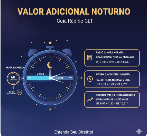 O cálculo do adicional noturno envolve três variáveis principais: salário base, horas noturnas trabalhadas e o percentual de adicional. Vamos detalhar o passo a passo: